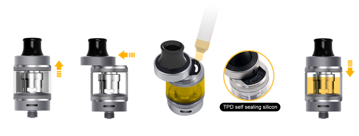 Le remplissage du Tigon est très simple : il suffit de soulever puis de faire glisser la partie haute vers l'arrière pour qu'elle révèle l'orifice de remplissage qui présente une membrane qui a la particularité d'empêcher les fuites même lorsque l'atomiseur est ouvert.